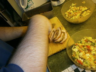 The results are delicious, but we didn't manage to get a photo of them before they were devoured! Have a photo of me carving it up and the salads made by Katie and Elaine instead!